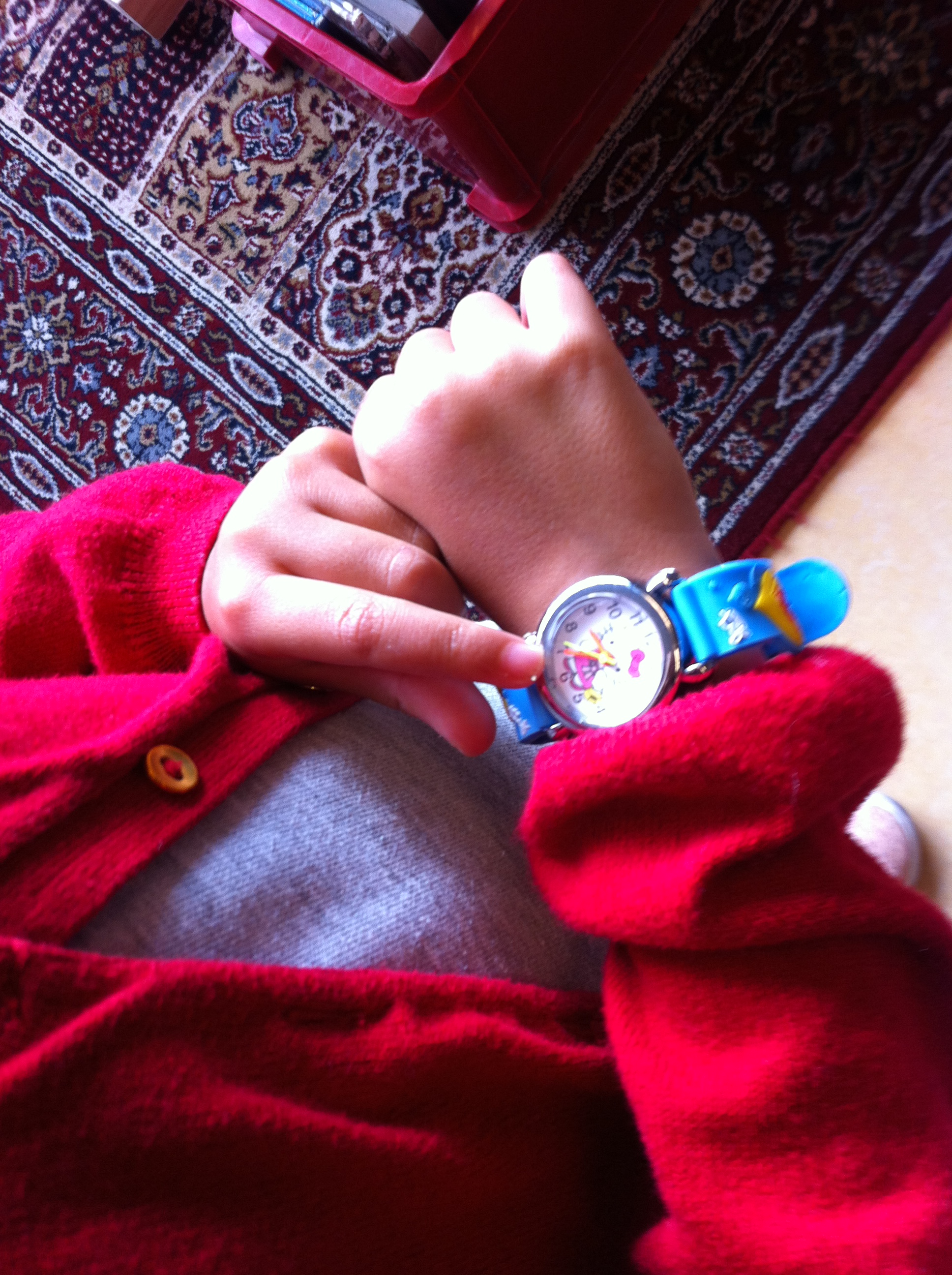 Iemand heeft een nieuw ‘Hello Kitty-horloge’ en er volgt een gesprekje tussen 2 kinderen over klokkijken, cijfers en de tijd. Naast allerlei rekenvaardigheden, worden ook tal van gespreksvaardigheden geoefend: eigen ervaringen verwoorden, elkaar laten uitspreken, initiatief nemen, vragen stellen, ingaan op wat de ander zegt.