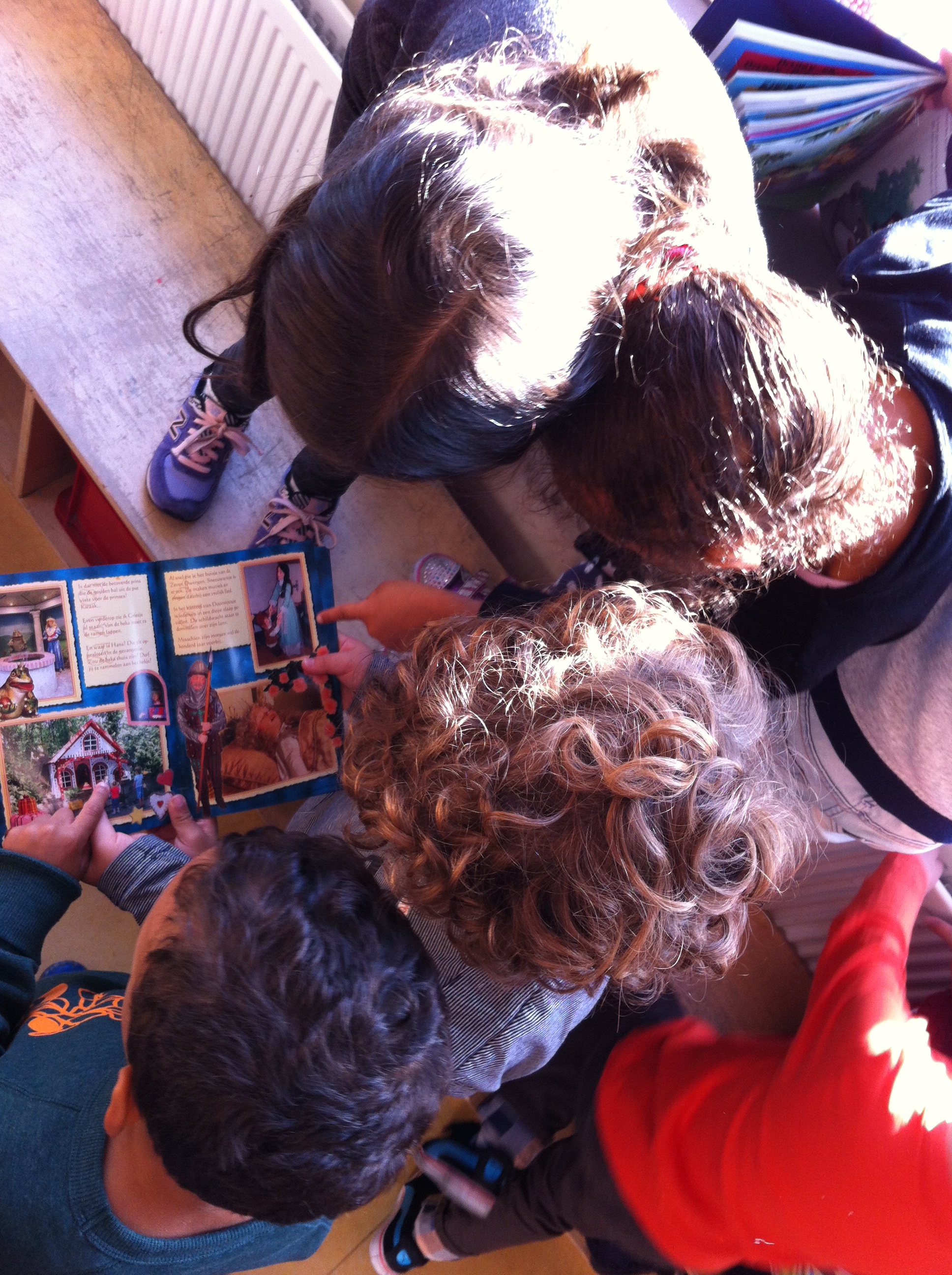 Vandaag wordt er gekeken in prentenboeken, sommige kinderen alleen, anderen met z’n tweeën of drieën of soms met nog meer kinderen tegelijk. Intussen wordt er gesproken over de illustraties in het boek, voorspellen kinderen aan de hand van de illustraties hoe het verhaal zal verder gaan of afloopt. Kinderen met een grote woordenschat brengen ongemerkt hun kennis over.